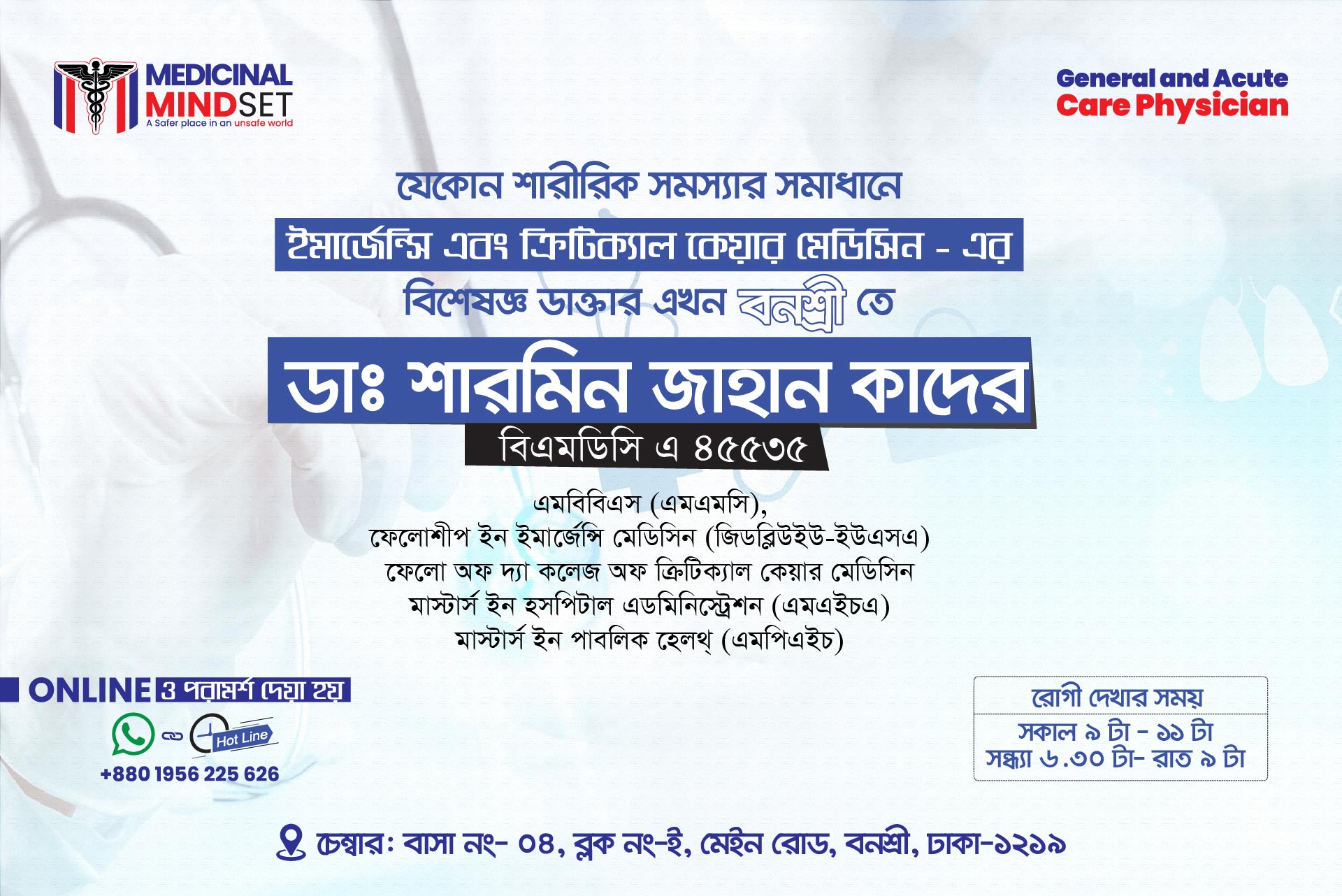 Medicinal Mindset - Your Trusted Emergency & Critical Care Partner.Welcome to Medicinal Mindset, your reliable destination for emergency and critical care services in Dhaka. We are committed to providing top-notch medical consultation and urgent care under the expert guidance of Dr. Sharmin Jahan Kader, a highly qualified specialist in Emergency & Critical Care Medicine.